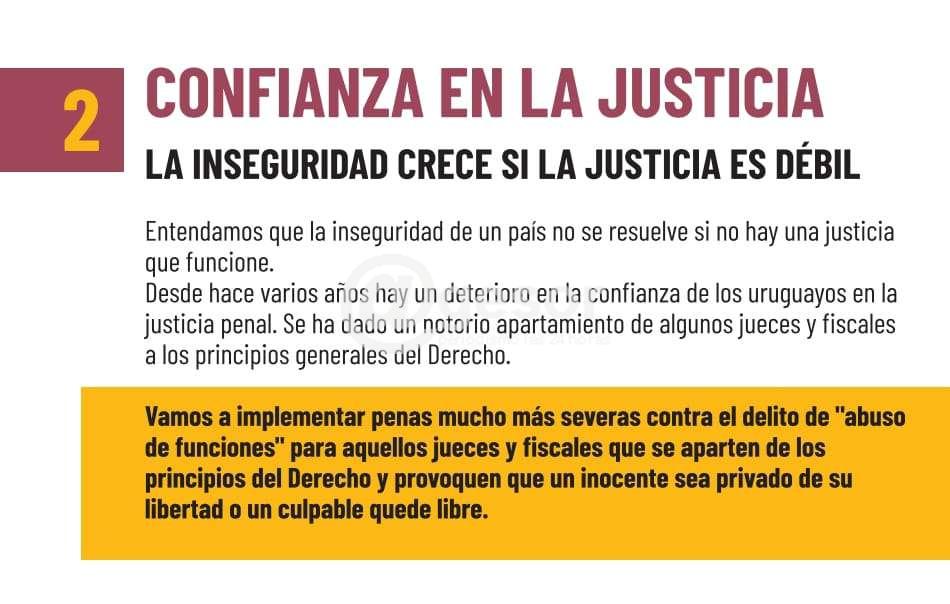 Vamos a implementar penas mucho más severas contra el delito de "abuso de funciones" para aquellos jueces y fiscales que se aparten de los principios del Derecho y provoquen que un inocente sea privado de su libertad o un culpable quede libre.