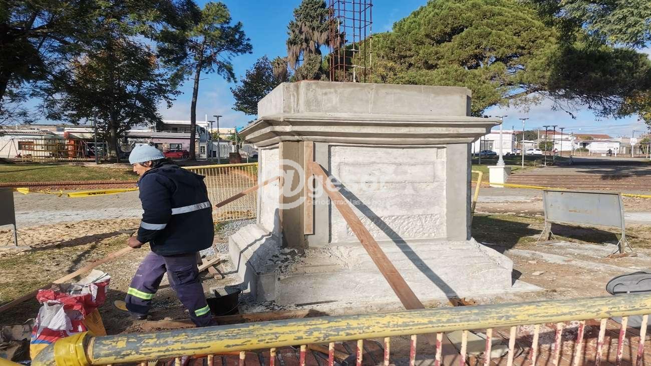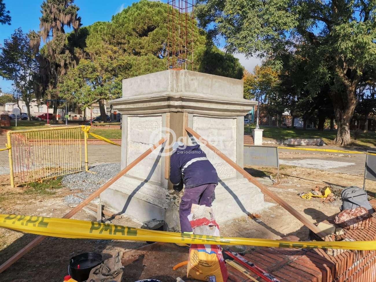 Los trabajos en el sector central de plaza "Rivera" de la ciudad de Mercedes, los realiza personal municipal bajo la supervisión del artista Federico Gauthier quien está a cargo de la confección tanto de la columna como de la estatua.