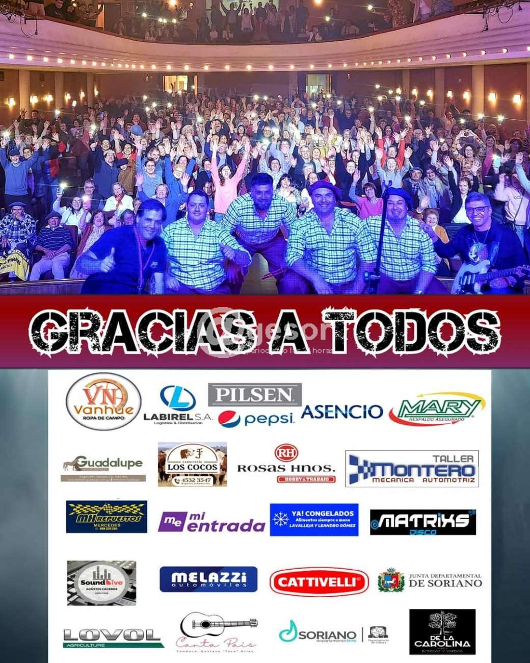 Silvio Retamosa, Agustín Cáceres, Pablo Poveda, Kevin Cano y todo el equipo que conforma "Levantando Polvadera" disfrutó de una noche inolvidable en su tierra, Mercedes, con la gente aplaudiendo y viviendo una jornada a todo canto y baile en el teatro histórico, con la participación de artistas invitdos como "Danza Uruguay" de Young, el Flaco Gallaztegui de Palmitas, Pablo Aboal y dos compañeros como Pablo Gadea que fuera parte del grupo en su momento y Juanma Gutiérrez que en la actuallidad interpreta algunos temas junto a ellos, ambos están en la fotografía con el público de fondo colmando el teatro. Felicitaciones!!!