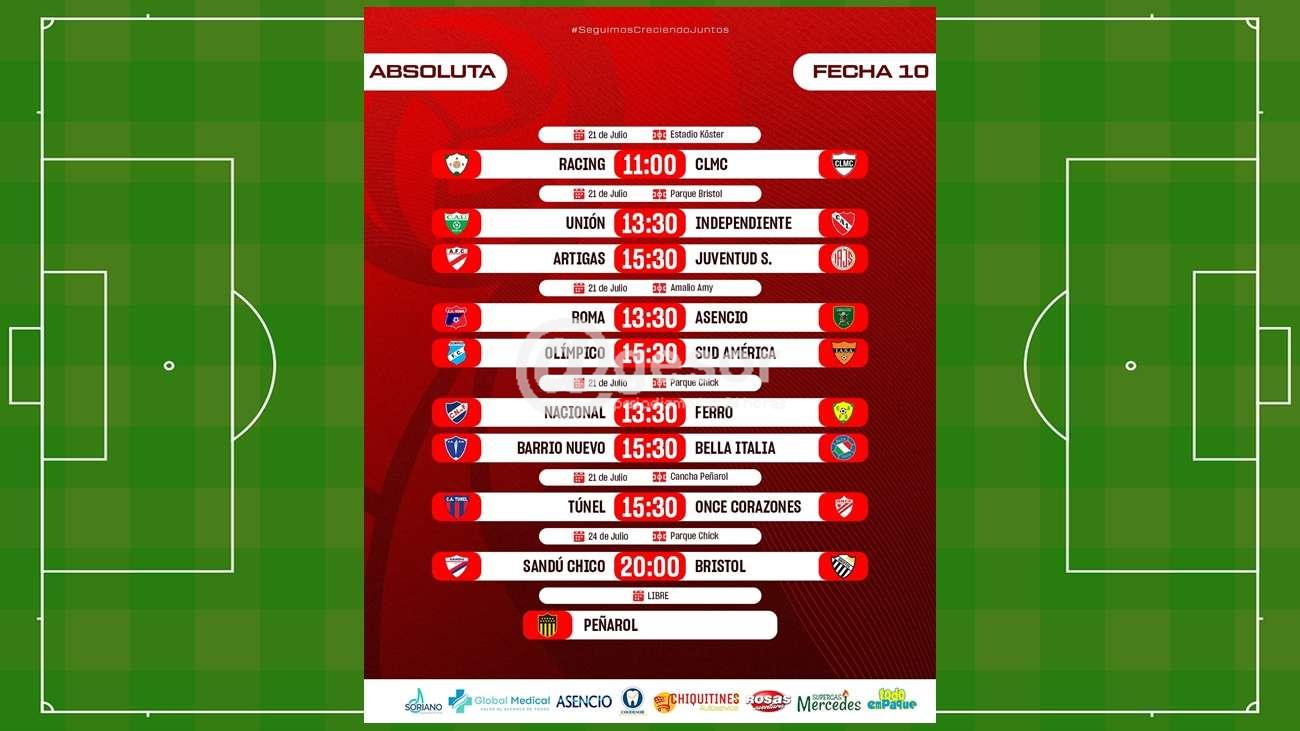 Se reunió la Liga Departamental de Soriano bajo la presidencia del Dr. Pablo Marrero a los efectos de fijar la decima fecha del torneo mercedario a disputarse el próximo domingo, y parte el día martes. La fecha comienza a la hora 11 horas el domingo con el partido entre Racing y CLMC en el Koster. En cancha de Peñarol juegan desde las 15 y 30horas Túnel vs Once Corazones. En el Amy a las 13 y 30 horas juegan Roma y Asencio, y a segunda hora Olímpico y Sud América. En el parque Chick Nacional se enfrenta a Ferro a primera hora, y a las 15 y 30 horas Barrio Nuevo juega ante Bella Italia.