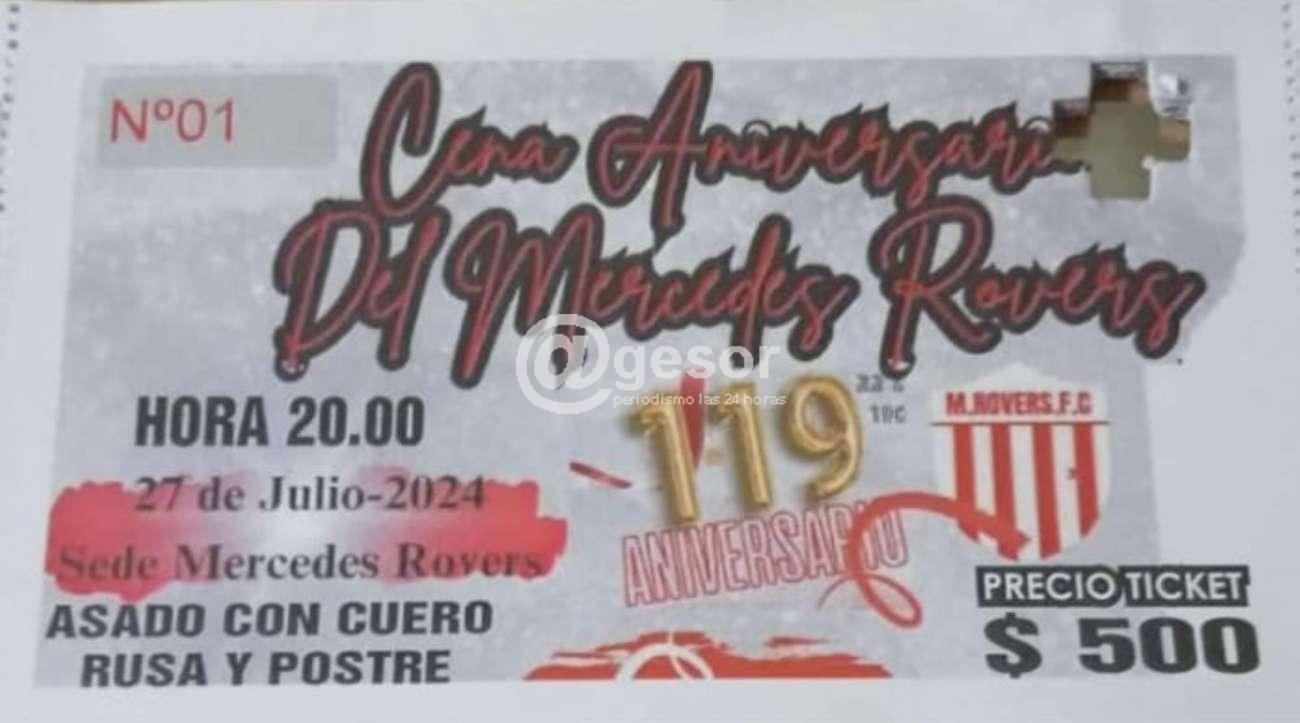 Este sábado 27 de julio se realiza la Cena Aniversario del Mercedes Rovers en la sede de la institución ubicada en Gomensoro entre Don Bosco y Casagrande donde estará celebrándose el 119 aniversario del club.