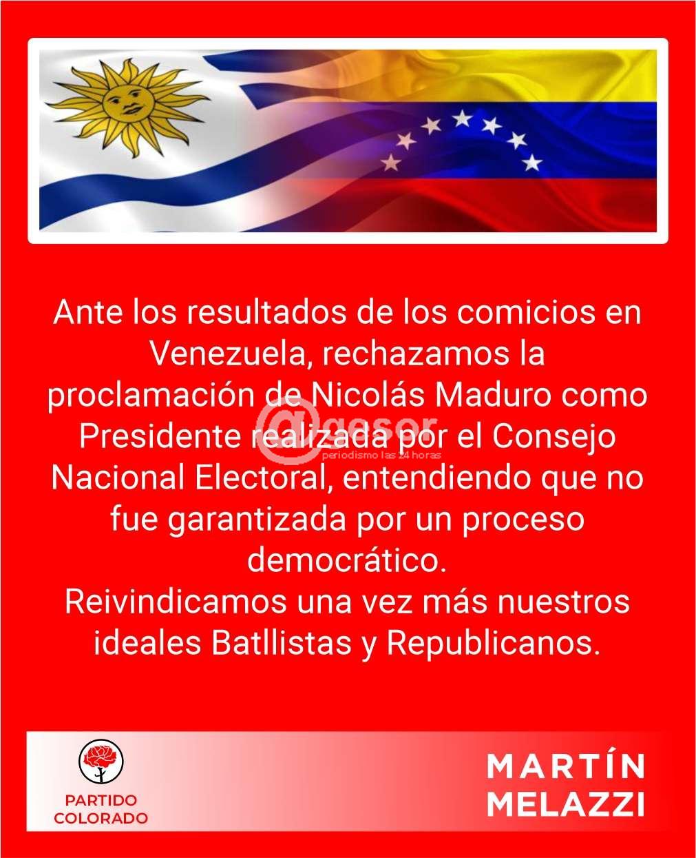 Ante los resultados de los comicios en Venezuela, rechazamos la proclamación de Nicolás Maduro como Presidente realizada por el Consejo Nacional Electoral, entendiendo que no fue garantizada por un proceso democrático.