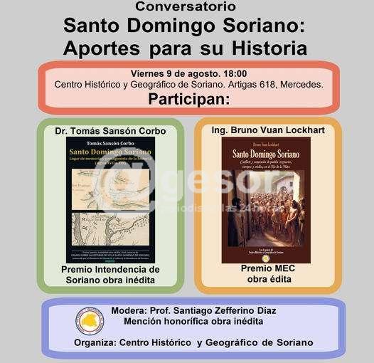 Este viernes 9 de agosto 18.00 horas en Centro Histórico y Geográfico de Soriano, en Artigas 618 de Mercedes, con la participación del Dr. Tomás Sansón Corbo e Ing. Bruno Vuan Lockhart, estará desarrollándose Conversatorio titulado "Santo Domingo Soriano - Aportes para su Historia".