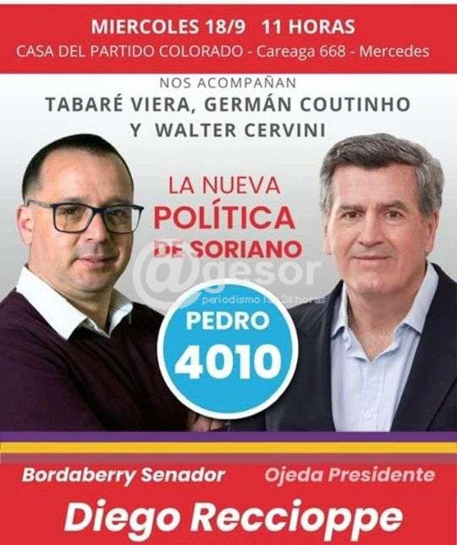 Este miércoles 18 a la hora 11.00 se invita a las instalaciones de la Casa del Partido Colorado de Mercedes para la presentación de la lista de Pedro Bordaberry junto a los candidatos y referentes por nuestro departamento con Diego Reccioppe a la Diputación en la Lista 4010.