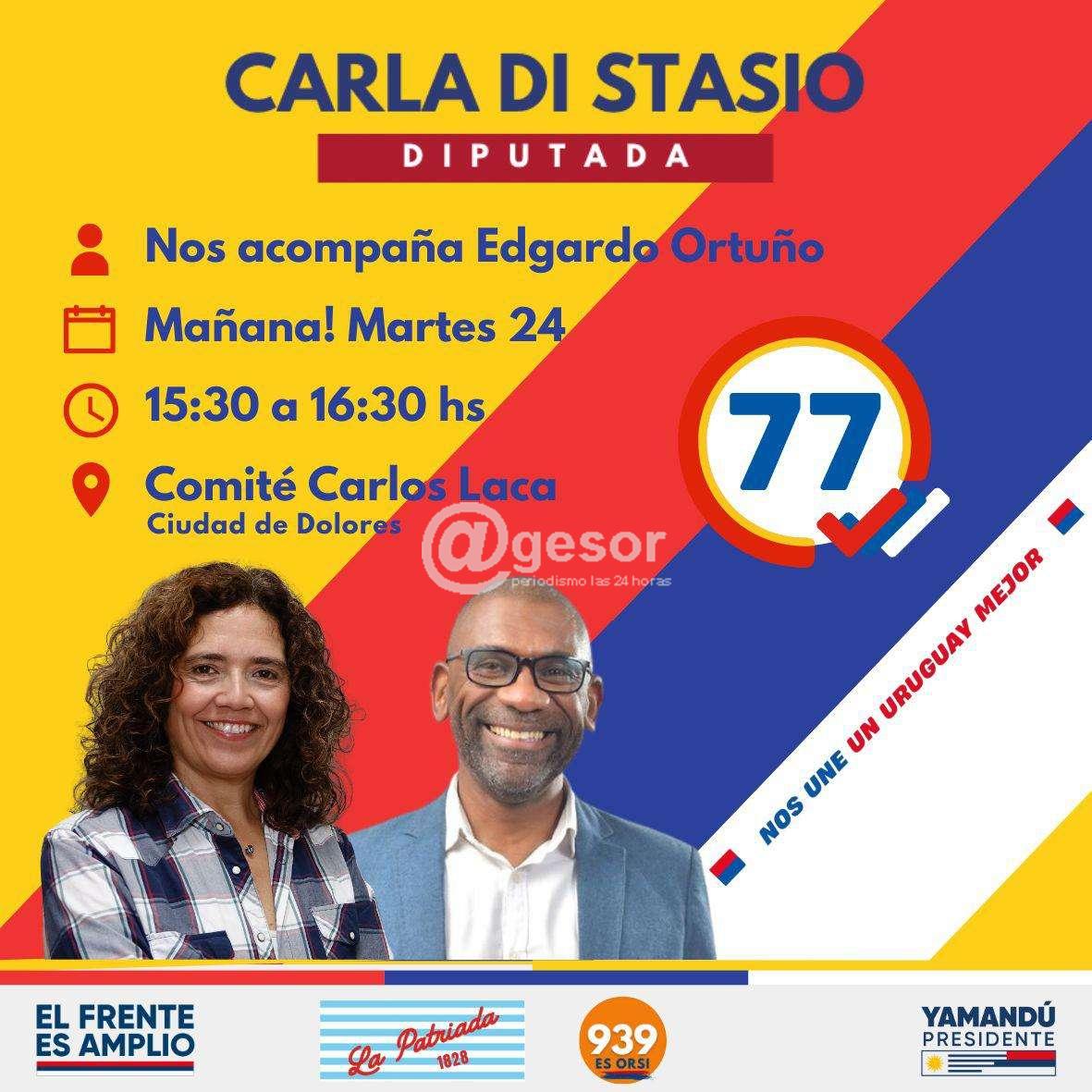 La Lista 77 invita a un par de actividades en Dolores y Mercedes este martes 24 de setiembre.  La candidata a diputada Carla Di Stasio estará acompañada por Edgardo Ortuño, referente de la Vertiente Artiguista.
