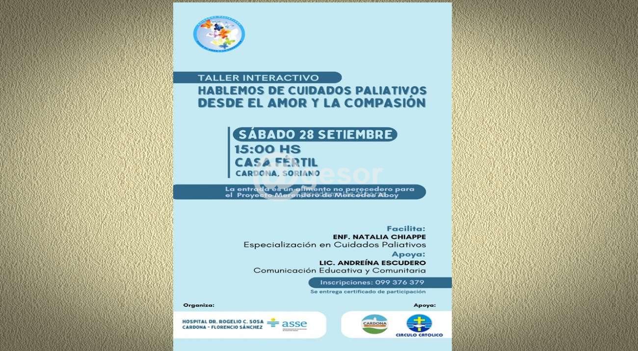 El sàbado 28 de setiembre se realizará en Cardona un Taller sobre cuidados paliativos. Estará  acargo de la enf. Natalia Chiappe, especializada en Cuidados Paliativos,m , apoyadapor la Lic. Andreìna Esdudero, Comunicacion Educativa y  Comunitaria.