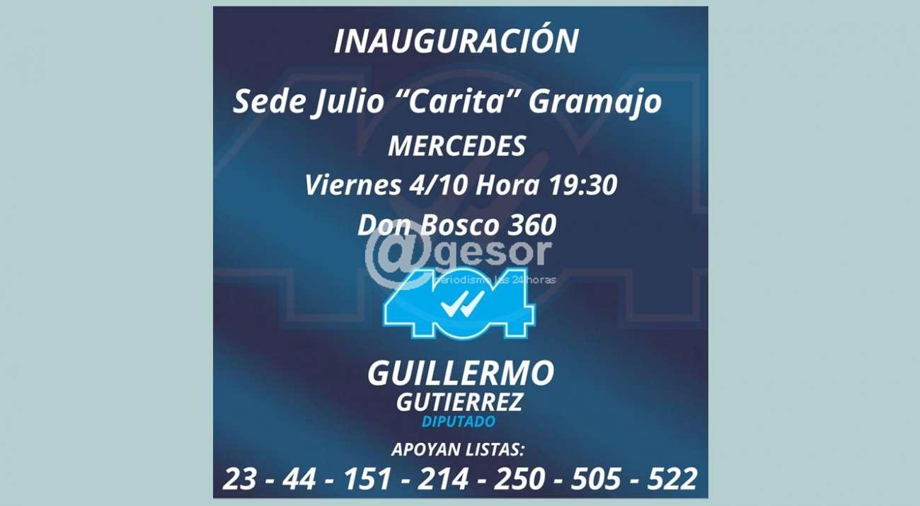 Este viernbes 4 de octubre, a las 19,30 horas se inaugura la sede Julio "Carita" Gramajo, en calle Don Bosco 360, de Mercedes. Es en respaldo a la candidatura a la diputaciòn de Guillermo Gutiérrez.