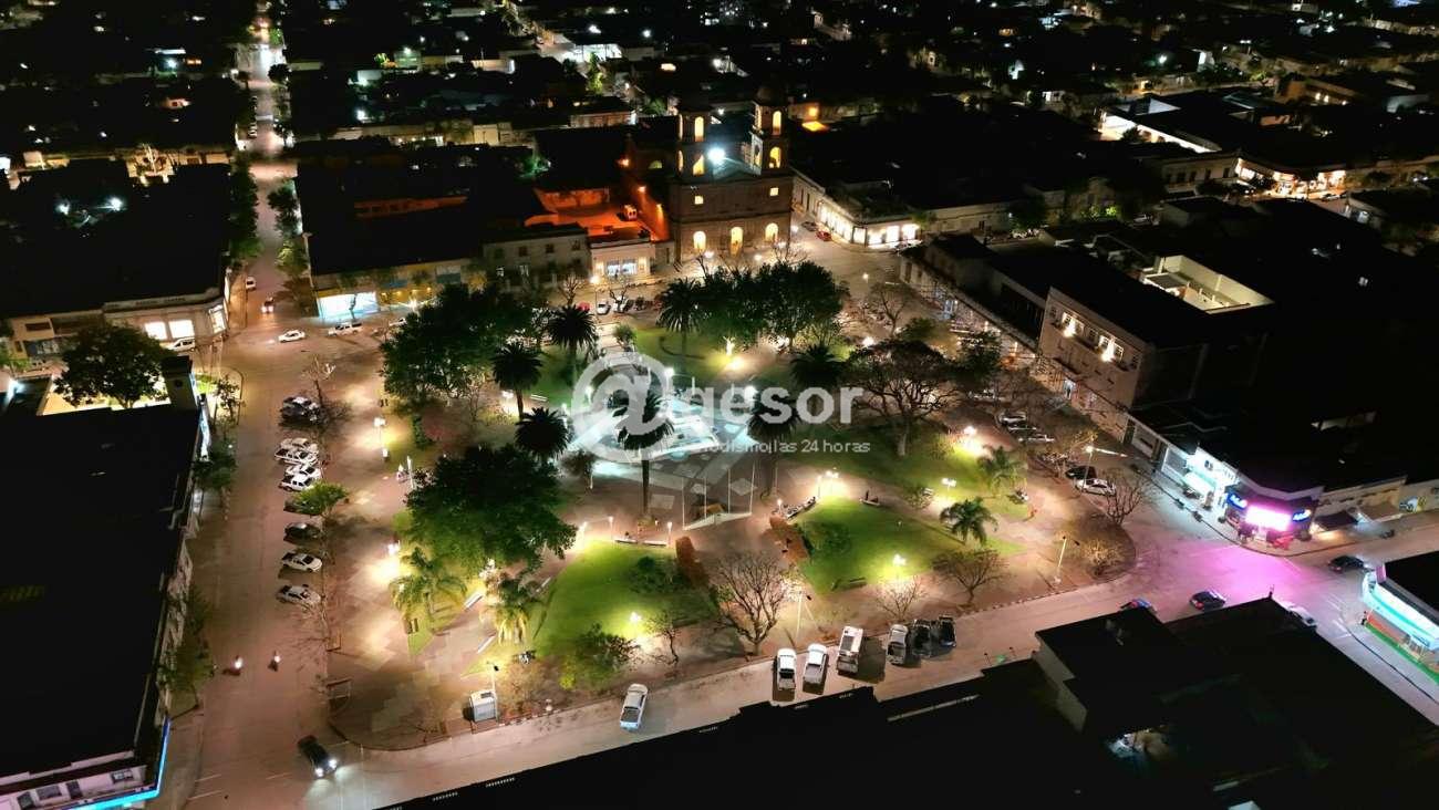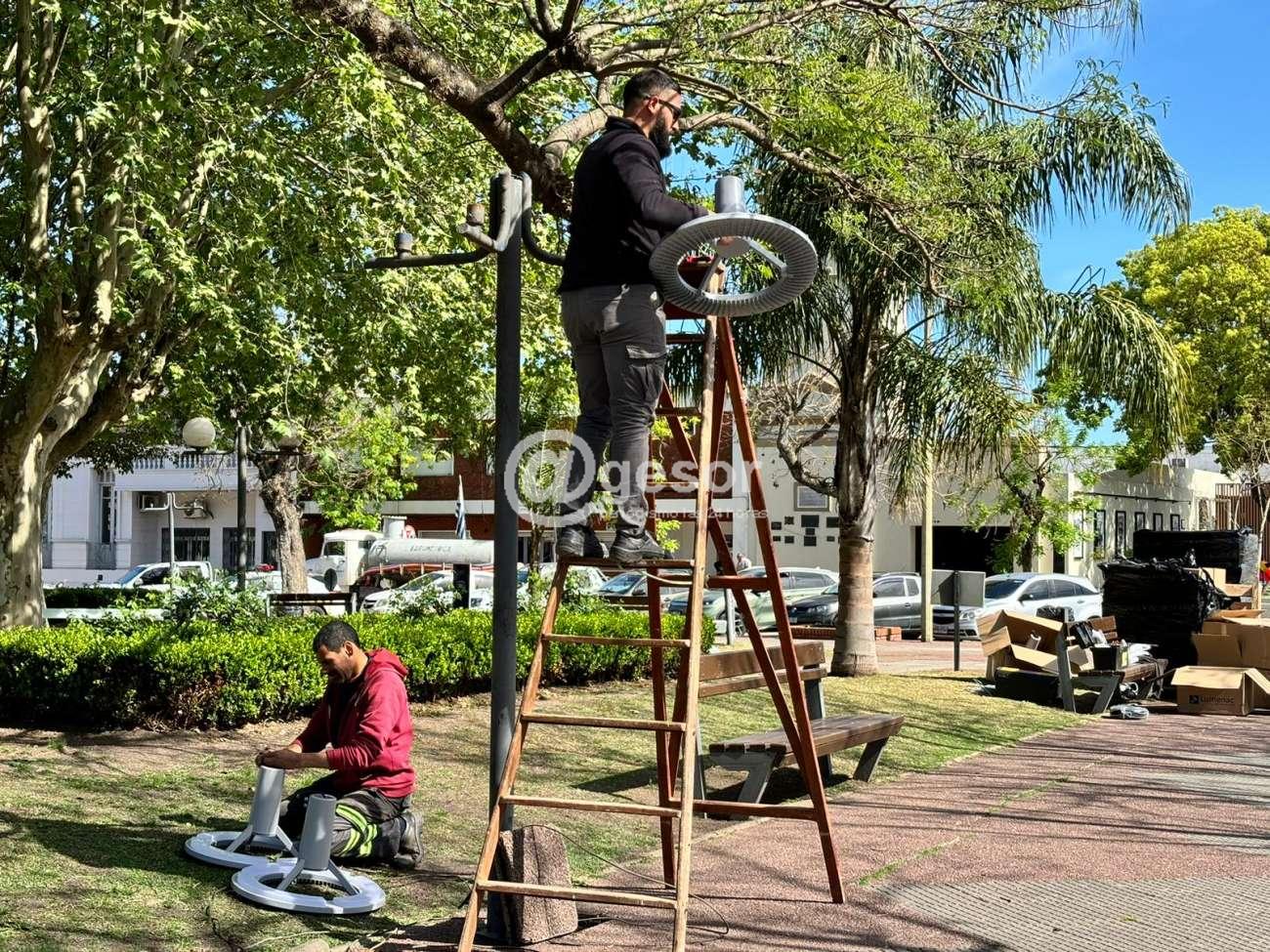 Quedó culminado el recambio de las antiguas farolas redondas por 60 focos LED de 50w en trabajo conjunto del Municipio con la Intendencia de Soriano, en plaza Constitución de Dolores.