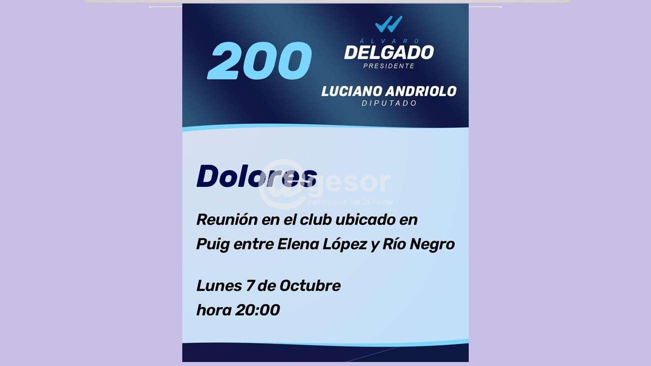 La lista 200 del Partido Nacional realiza una reunión, este lunes 7 de octubre, en su local de calle Elena López y Río Negro. Estará presente Luciano Andriolo, candidato a Diputado.