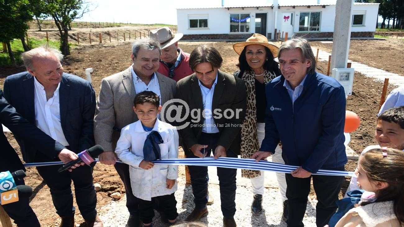 El presidente de la República, Luis Lacalle Pou, encabezó el acto de inauguración de un plan de viviendas de Mevir en Paso de los Mellizos, departamento de Río Negro, que lleva el nombre de María Aurora Velázquez Díaz, Doña Aruca. También participaron el titular de la institución, Juan Pablo Delgado; el ministro y el subsecretario de Vivienda y Ordenamiento Territorial, Raúl Lozano y Tabaré Hackenbruch respectivamente, y el secretario general de la Intendenta de Río Negro, Pablo Flores, entre otras autoridades.