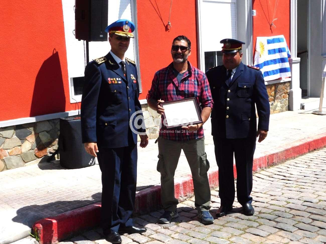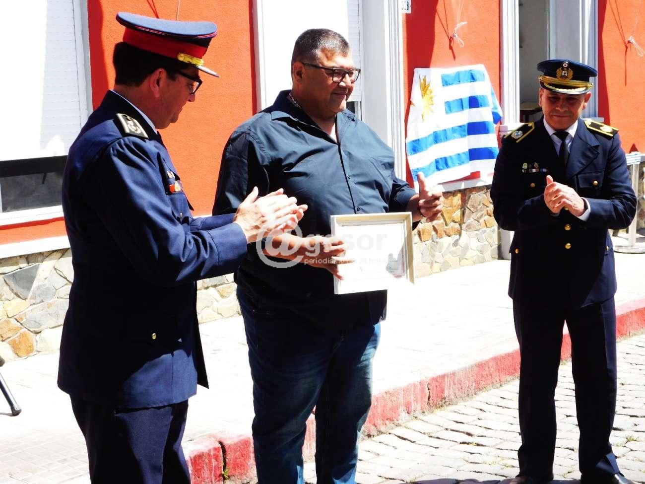 El Cabo Ayrton Díaz por su reciente pase a retiro voluntario habiendo desempeñado funciones en el Destacamento de Bomberos de Mercedes por casi 25 años de manera ininterrumpida, entregando el Sub Jefe de Policía Crio. May. Luis Astigarraga y el Jefe de Destacamento de Mercedes, Sub Crio. José Cantos.