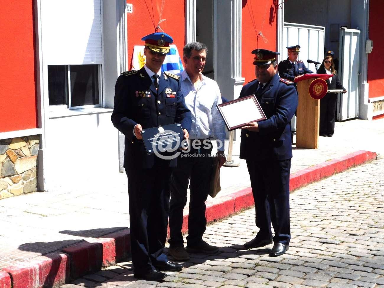 Finalmente la Jefatura de Policía de Soriano en manos del Jefe y Sub Jefe de Policía, entregó placa conmemorativa por los 100 años de instalación de los servicios de Bomberos de Mercedes, recibiéndola el Director Nacional de Bomberos junto al Jefe del Destacamento de Mercedes.