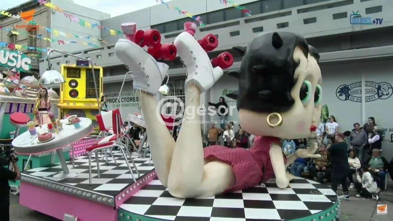 La carroza recrea el típico local de una cafetería de los años 50, cargados de colores vibrantes resaltados por el neón y sobre piso en damero blanco y negro.