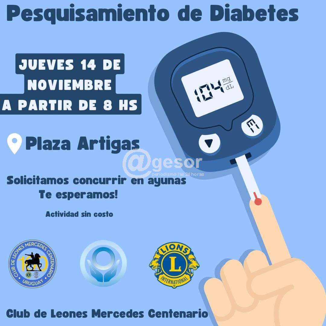 Este jueves 14 de noviembre a partir de la hora hora, en plaza Artigas de Mercedes, el Club de Leones Mercedes Centenario organiza jornada de pesquisamiento de diabetes.