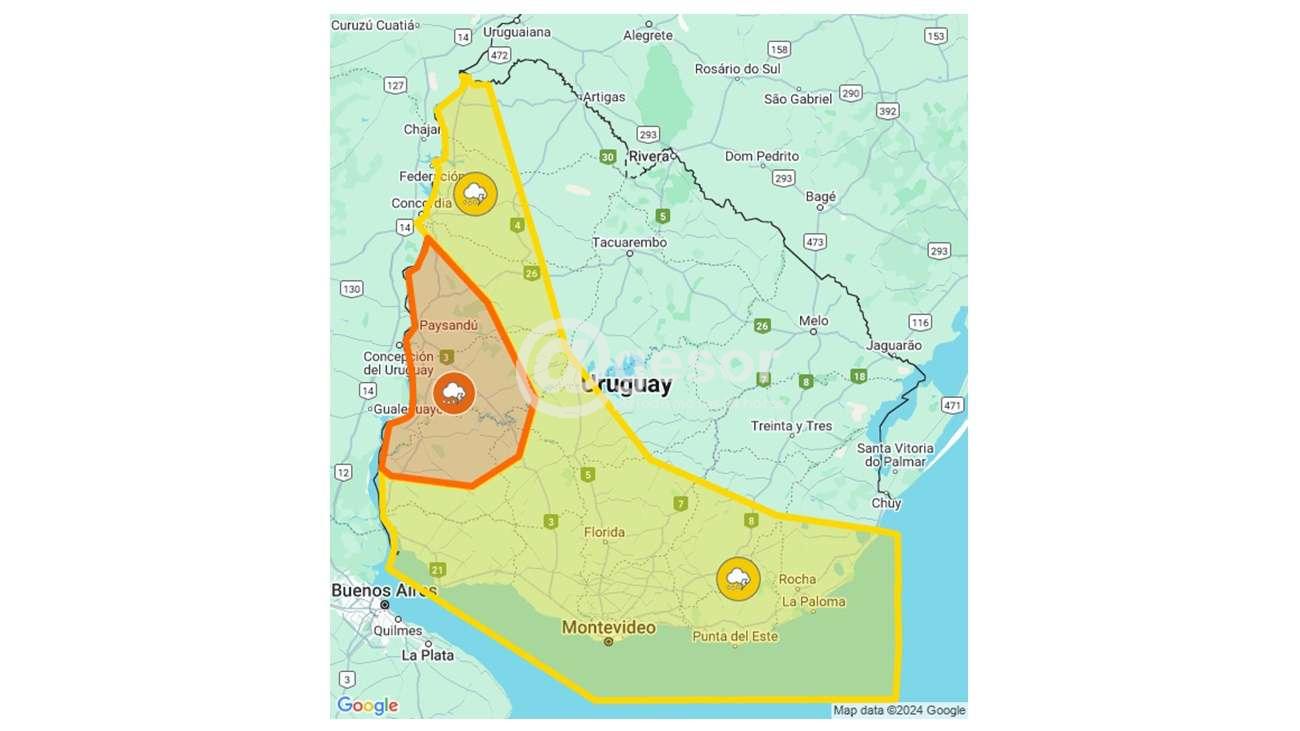Descripción: Frente frío ingresa por el litoral oeste del país generando lluvias y tormentas, algunas puntualmente fuertes y/o severas. Cabe destacar que en zonas de tormentas, podrán registrarse rachas de vientos muy fuertes, precipitaciones (abundantes/copiosas), caída de granizo e intensa actividad eléctrica. Se continuará monitoreando la situación y ante eventuales cambios se informará.