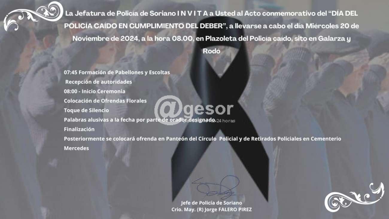 La Jefatura de Policía de Soriano está invitando al acto conmemorativo del Día del Policía Caído en Cumplimiento del Deber, a llevarse a cabo este miércoles 20 de noviembre 2024, a la hora 8.00, en plazoleta del Policía Caído, sita en Galarza y Rodó.