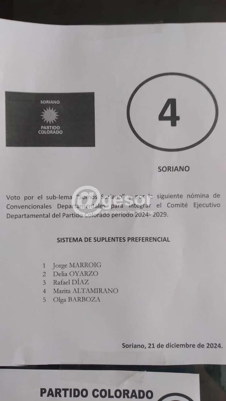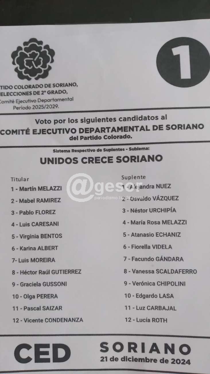 Los 68 convencionales departamentales del Partido Colorado de Soriano elegirán el sábado 21 de diciembre su Comité Ejecutivo Departamental. Se presentaron seis opciones. La lista 1 encabezada por Martín Melazzi, la 2 por Freddy Planchón, la 3 por Leonel Silva, la 4 por Jorge Marroig, la 5 por Andrés Centurión y la 6 por Santiago Fiorelli.