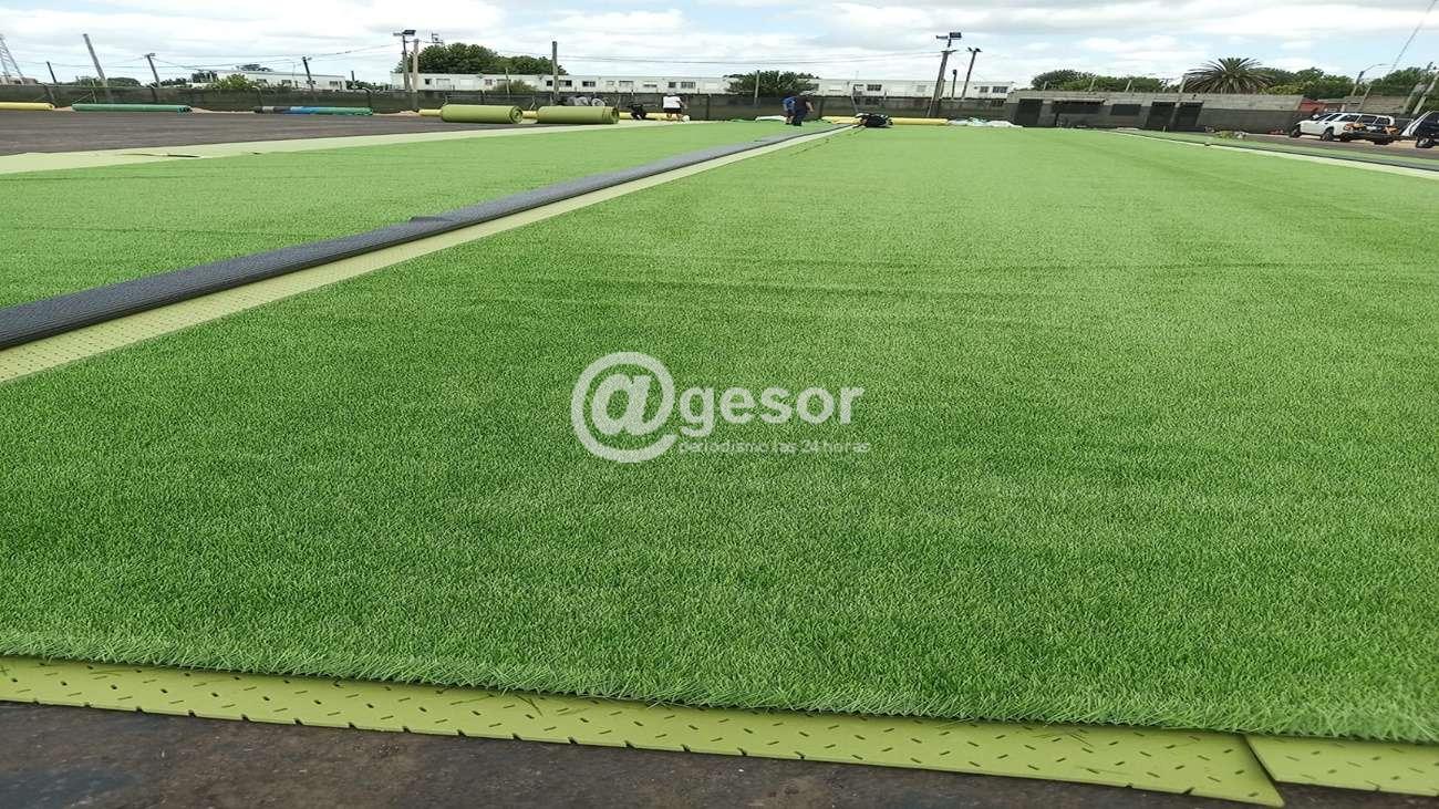 La colocación del césped artificial se concreta tras los trabajos realizados por el Dpto. de Obras de la comuna, que conformó la base del terreno y posteriormente realizó la imprimación asfáltica necesaria para proceder a la extensión de los rollos del césped.