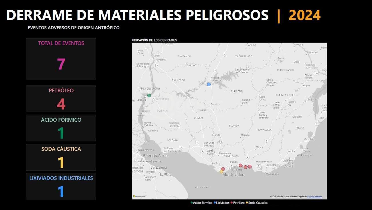 En 2024 se registraron siete derrames de materiales peligrosos. Cuatro de ellos involucraron petróleo, todos debidos a roturas en el oleoducto de la empresa ANCAP. El primer derrame ocurrió el 17 de junio en el departamento de Canelones, a la altura del kilómetro 56 de la ruta Interbalnearia.