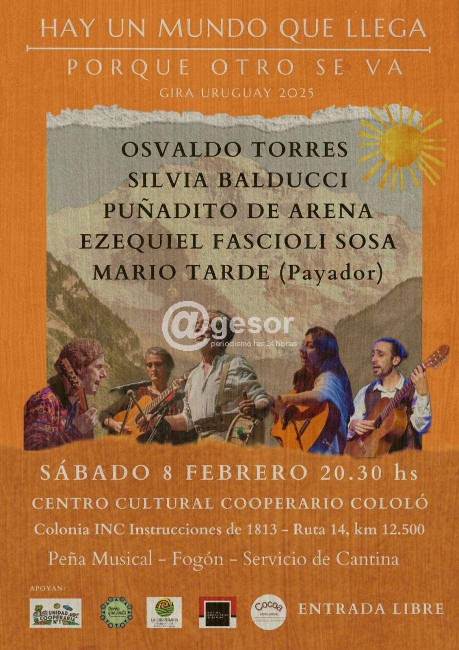 Sábado 8/2. 20.30 hs. Centro Cultural Cooperario Cololó (Colonia Instrucciones del Año XIII, Unidad Cooperaria N°1, Ruta 14, km 12.500, Soriano). Entrada libre, aporte voluntario a la gorra.