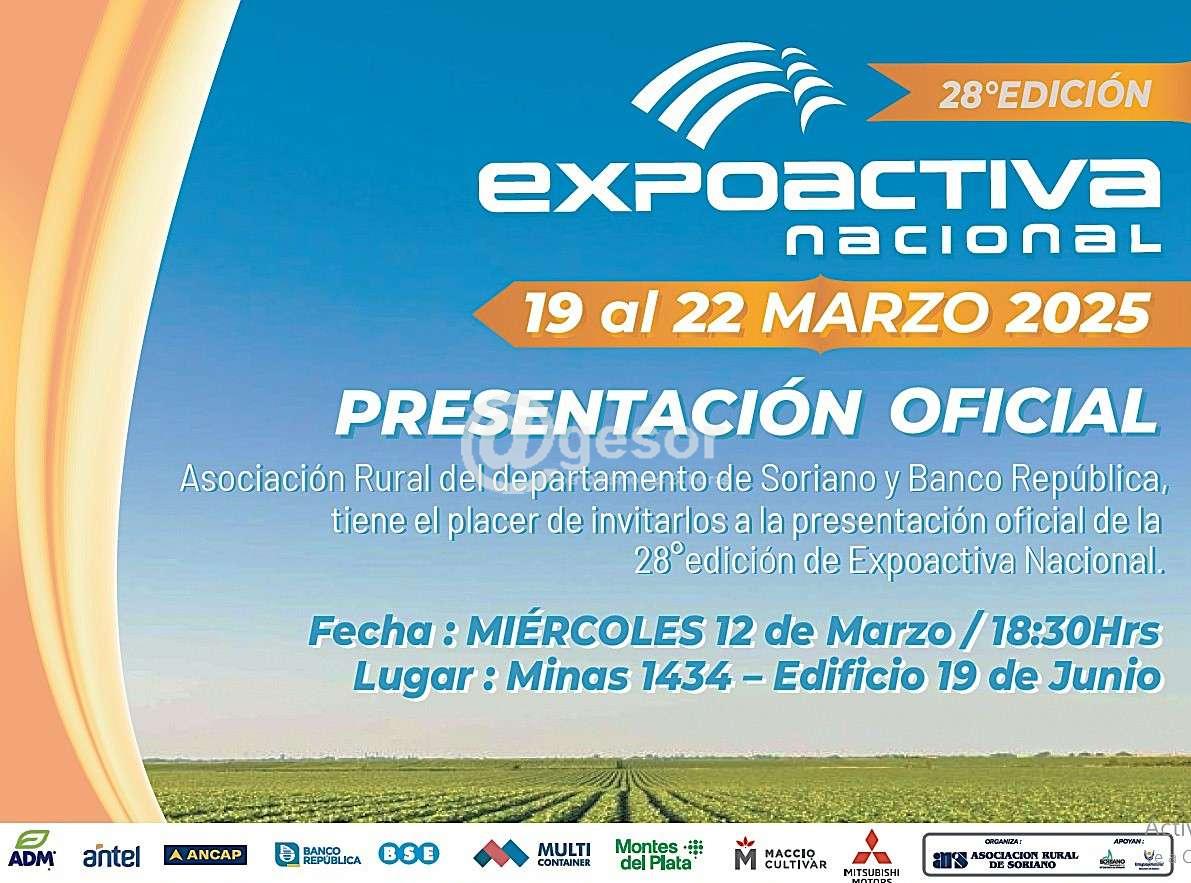 El miércoles 12 de marzo en sala del Banco República en Montevideo sede 19 de Junio se realizará la presentación oficial de ExpoActiva 2025 a las 18.30 horas en el edificio ubicado en Minas 1434.
