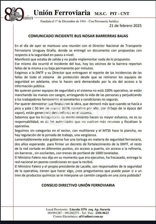 En dicho comunicado expresa a Unión Ferroviaria: