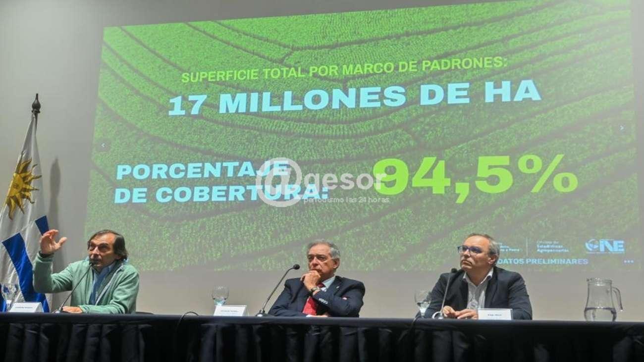 En la presentación participaron el Director Técnico de INE Diego Aboal, el Ministro de Ganadería, Agricultura y Pesca Fernando Mattos y el Director de Censo General Agropecuario Leonardo Arenare.