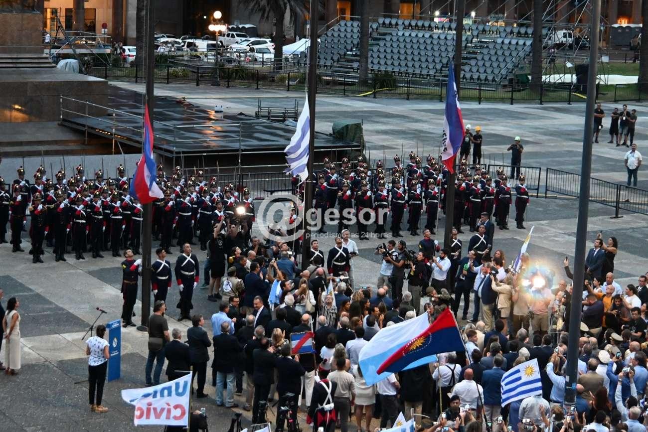 Allí lo esperó la guardia de honor, saludó a los efectivos del Regimiento de Blandengues de Artigas y, luego de entonar las estrofas del himno nacional, arrió los pabellones patrios. El jefe de la Casa Militar entregó la bandera uruguaya a Lacalle Pou, quien estuvo acompañado por la vicepresidenta de la República, Beatriz Argimón; el secretario y la prosecretaria de la Presidencia, Rodrigo Ferrés y Mariana Cabrera, respectivamente, y el director de la Oficina de Planeamiento y Presupuesto (OPP), Fernando Blanco, así como todos los integrantes del gabinete ministerial. También asistieron exministros, autoridades de diferentes organismos y el expresidente Julio María Sanguinetti.