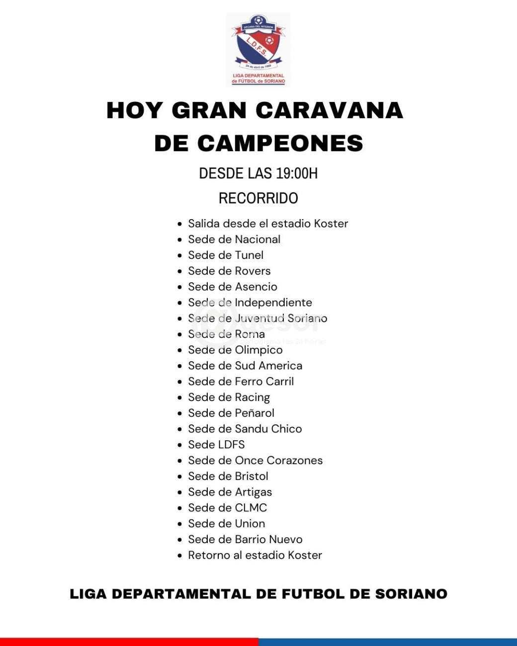 Saldrá a las 19.00 horas desde el estadio Luis Köster para recorrer la sede de todos los clubes que componen la Liga Departamental de Fútbol de Soriano.