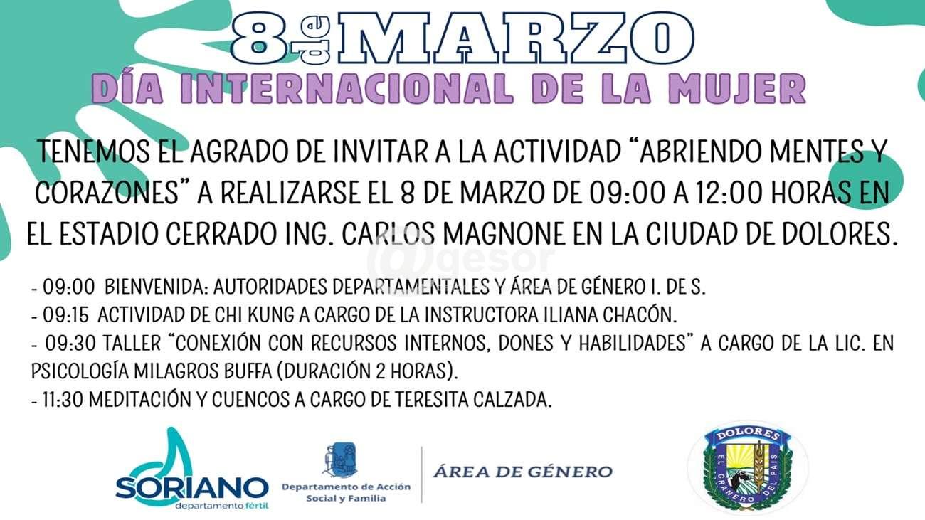 9 hs. - bienvenida a cargo de autoridades departamentales e integrantes del Área de Género de la Intendencia de Soriano.
