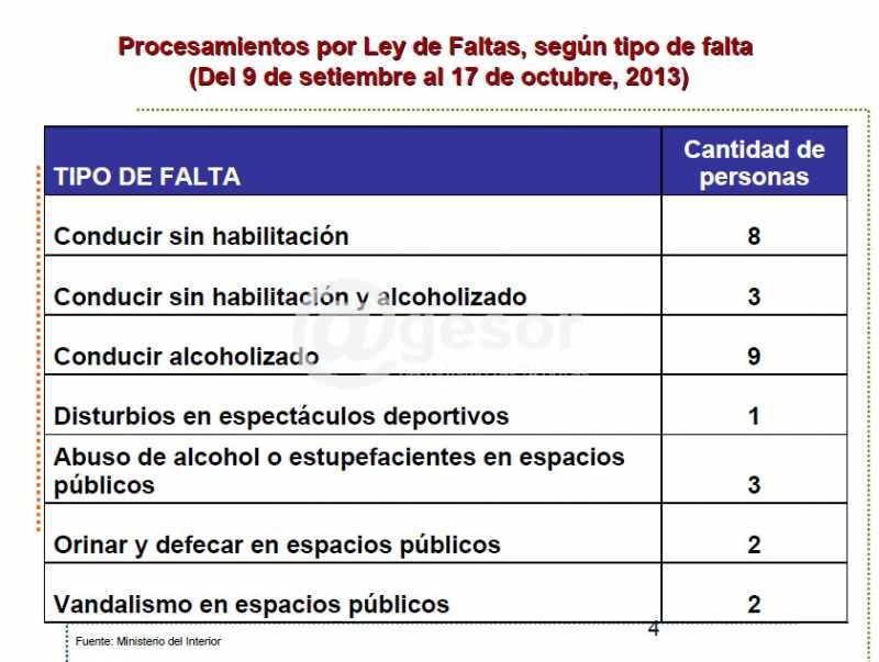 El 70% de las faltas penalizadas con trabajo comunitario, están relacionadas al tránsito, siendo su desglose el siguiente: conducir sin habilitación (8), conducir sin habilitación y alcoholizado (3), conducir alcoholizado (9), disturbios en espectáculos deportivos (1), abuso de alcohol o estupefacientes en espacios públicos (3), orinar y defecar en espacios públicos (2), vandalismo en espacios públicos (2).