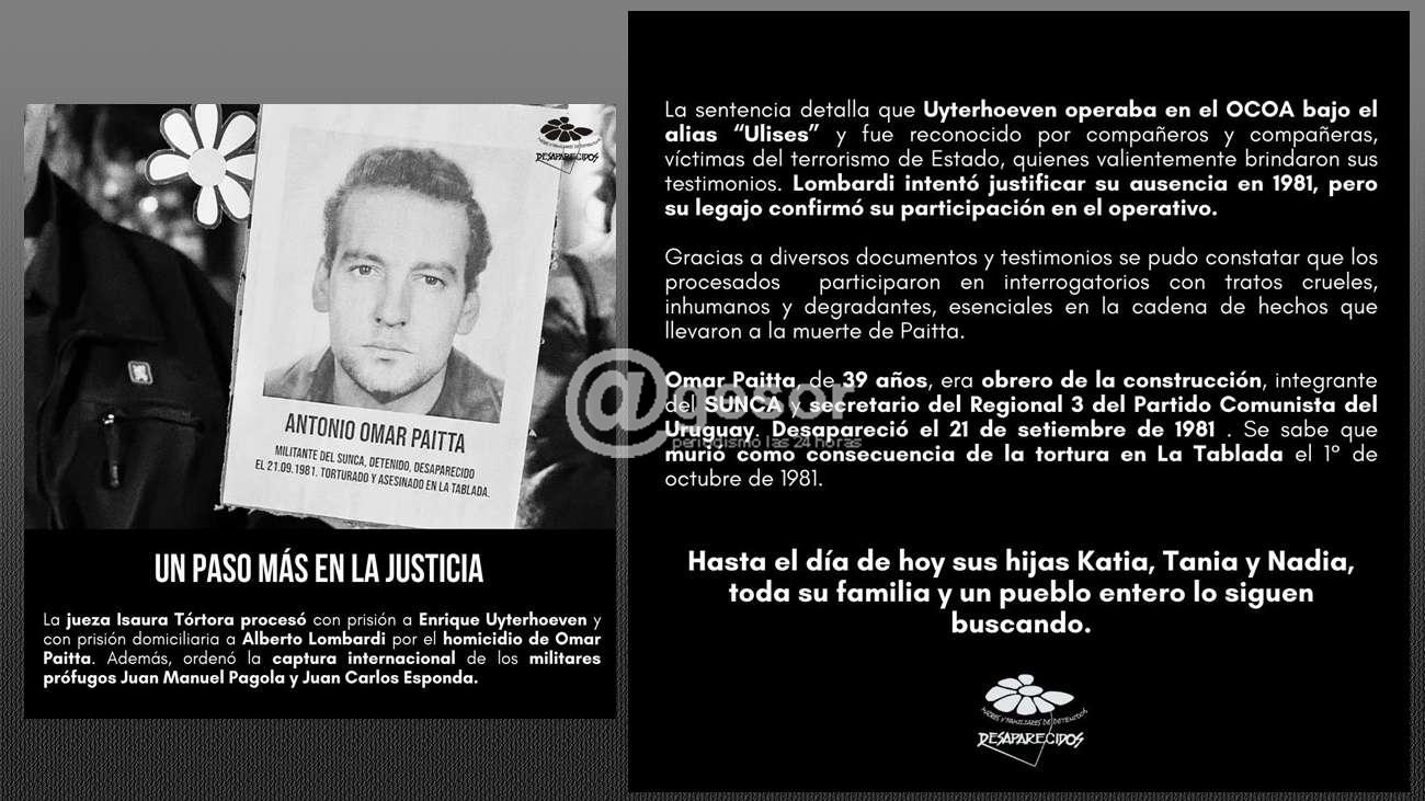 Omar Paitta, de 39 años, era obrero de la construcción, integrante del Sunca y secretario del Regional 3 del PCU. Desapareció el 21 de setiembre de 1981 . Se sabe que murió como consecuencia de la tortura en La Tablada el 1° de octubre de 1981. Hasta el día de hoy sus hijas Katia, Tania y Nadia, toda su familia y un pueblo entero lo siguen buscando.