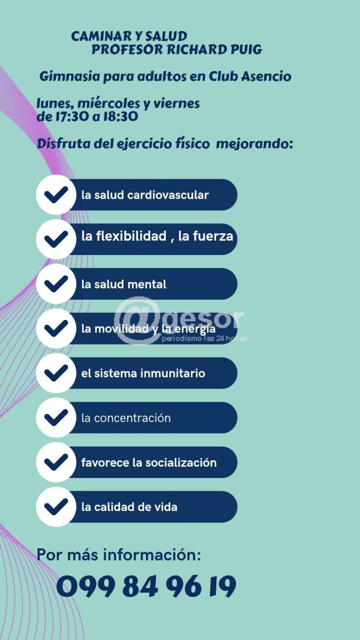 El reconocido docente y entrenador de atletas, Prof. Richard Puig está invitando a concurrir a ser parte de su proyecto "Caminar y salud" de gimnasia para adultos que reanudó este año, tras las clases iniciadas el año pasado, en instalaciones del Club Asencio en Colón casi Casagrande.