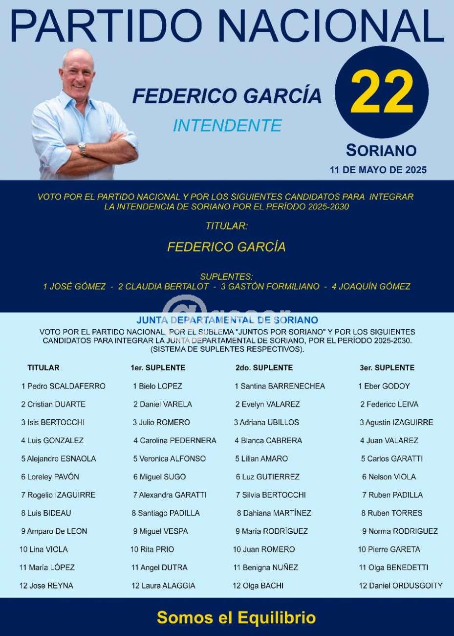 La 22 impulsa la candidatura a la Intendencia de Soriano de Federico García y a la Junta Departamental en los primeros lugares de una lista que tiene como sublema "Juntos por Soriano", lleva como titulares por su orden a: Pedro Scaldaferro, Cristian Duarte, Isis Bertocchi, Luis González, Alejandro Esnaola y a su vez como primeros suplentes de éstos a Bielo López, Daniel Varela, Julio Romero, Carolina Pedernera, Verónica Alfonso.