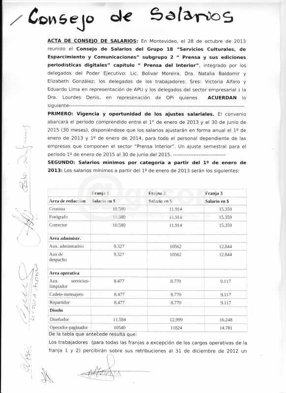 Este lunes luego de meses de discusión entre las patronales nucleadas en OPI (Organización de la Prensa del Interior) y la APU (Asociación de la Prensa Uruguaya) sindicato de los trabajadores de los medios de comunicación, en este caso representado por el Sector Prensa (escrita), se firmó el acuerdo a nivel de Consejo de Salario cuyo resumen cuenta a @gesor la Presidenta del sector a nivel nacional, periodista Victoria Alfaro.