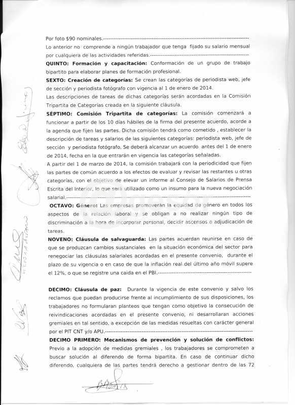 -La creación de tres nuevas categorías (Periodista-fotógrafo, Periodista web y Jefe de Sección), además de establecer un mínimo por nota y foto para los compañeros que no están en plantilla. Las dos primeras categorías son en los hechos, parte de la realidad cotidiana y su incorporación en este consejo de salarios, es sin lugar a dudas un gran logro.