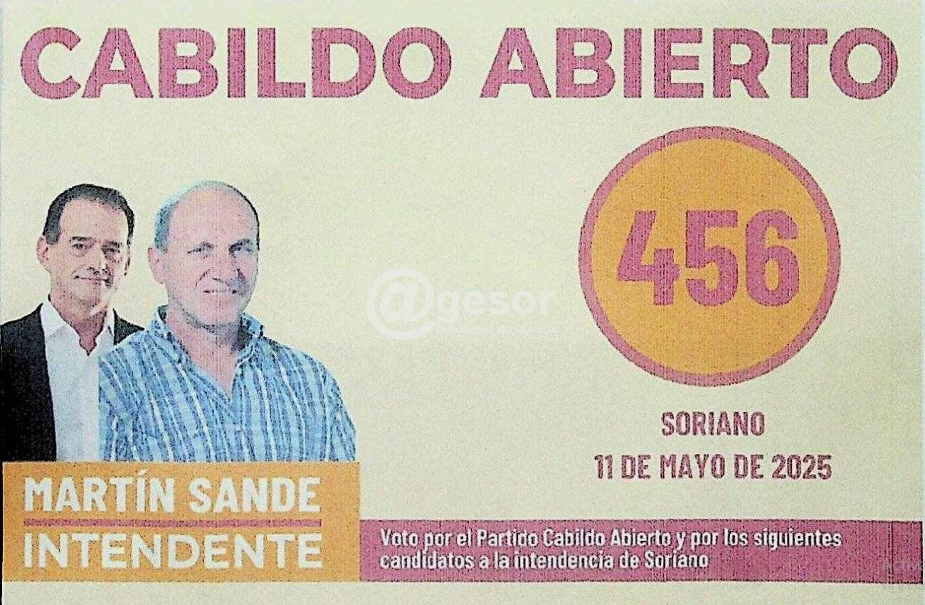Entre las opciones que el ciudadano dispondrá para elegir a las autoridades de la Intendencia de Soriano y la Junta Departamental el domingo 11 de mayo, se encuentra la de Cabildo Abierto que tiene como sublema "Todo por Soriano", se identifica con las hoja 456 y 741, lleva como candidato a Intendente de Soriano a Martín Sande y el mismo Sande encabeza la Lista 456 a la Junta Departamental, seguido por Sandra Eízaga, Osvald Hillmann, Jesús Ambrosio, Felipe Coello en los primeros lugares; mientras que la 741 la encabeza a la Junta Pedro Vázquez, seguido Silvia Acuña, Hugo Olivera, Magdalena Barboza.