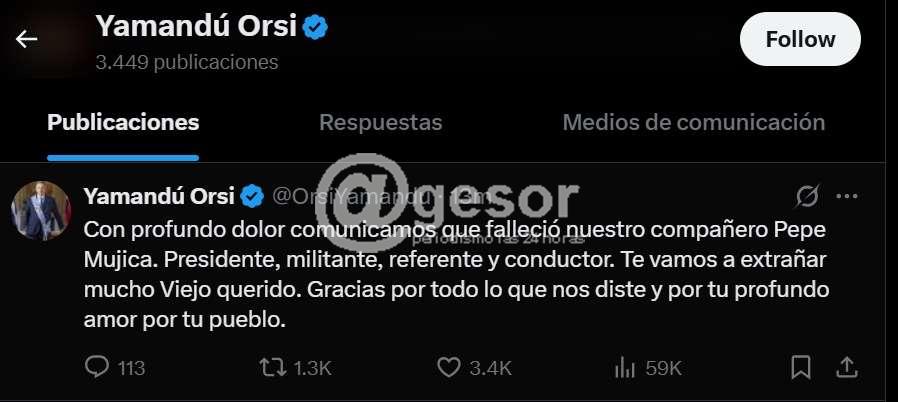“Con profundo dolor comunicamos que falleció nuestro compañero Pepe Mujica. Presidente, militante, referente y conductor. Te vamos a extrañar mucho Viejo querido. Gracias por todo lo que nos diste y por tu profundo amor por tu pueblo”, expresó en su cuenta de  la red social X el presidente Yamandú Orsi.