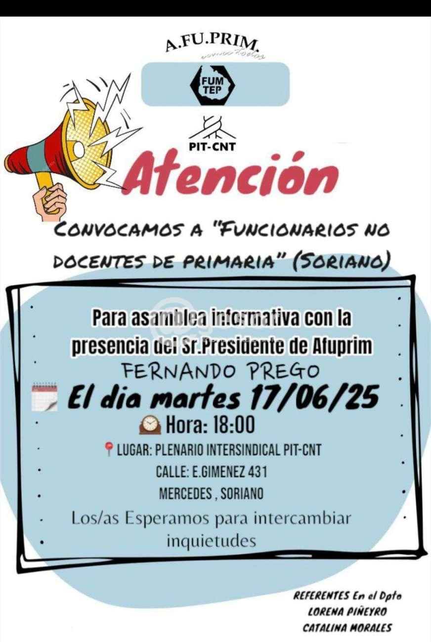 Precisamente en un momento donde se han dado diferentes situaciones a nivel de Primaria, que involucra a funcionarios docentes y no docentes, llega a Mercedes, el Presidente de la Asoociación de Funcionarios No Docentes de Primaria (AFUPRIM), Fernando Prego, quien estará participando de asamblea informativa a realizarse en sede del Plenario Intersindical de Soriano, en Giménez 431 de Mercedes.