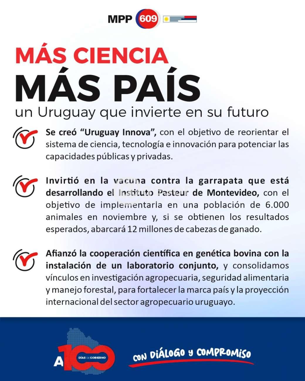 - Se creó "Uruguay Innova" con el objetivo de reorientar el sistema de ciencia, tecnología e innovación para potenciar las capacidades públicas y privadas.