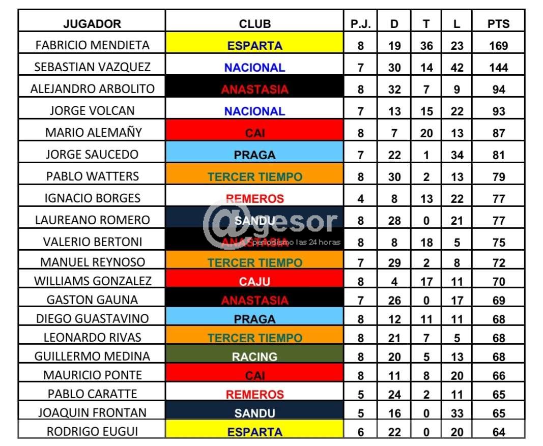 Posiciones: Independiente 16, Tercer Tiempo 15, Anastasia 14, Nacional y Racing 13, Esparta 11, Sandú Chico y Remeros 10, Praga y CAJU 9.