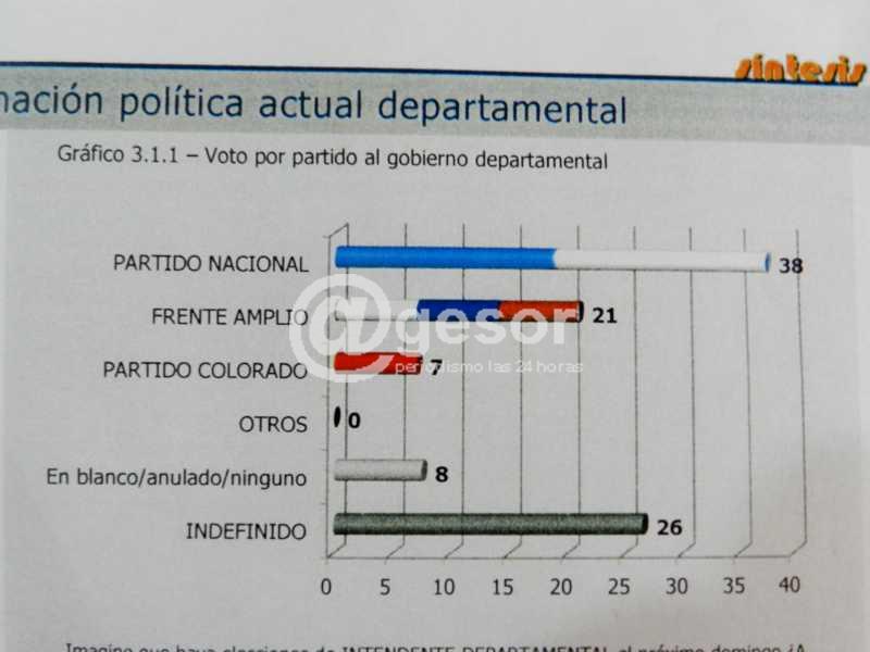 En lo que refiere a las elecciones departamentales, se observa que el 38% se inclina por el Partido Nacional, en segundo lugar está el Frente Amplio que obtiene el 21% y el 7% se inclina por el Partido Colorado, en tanto que el 8% votaría en blanco, anulado o ninguno y el 26% está indefinido aun.