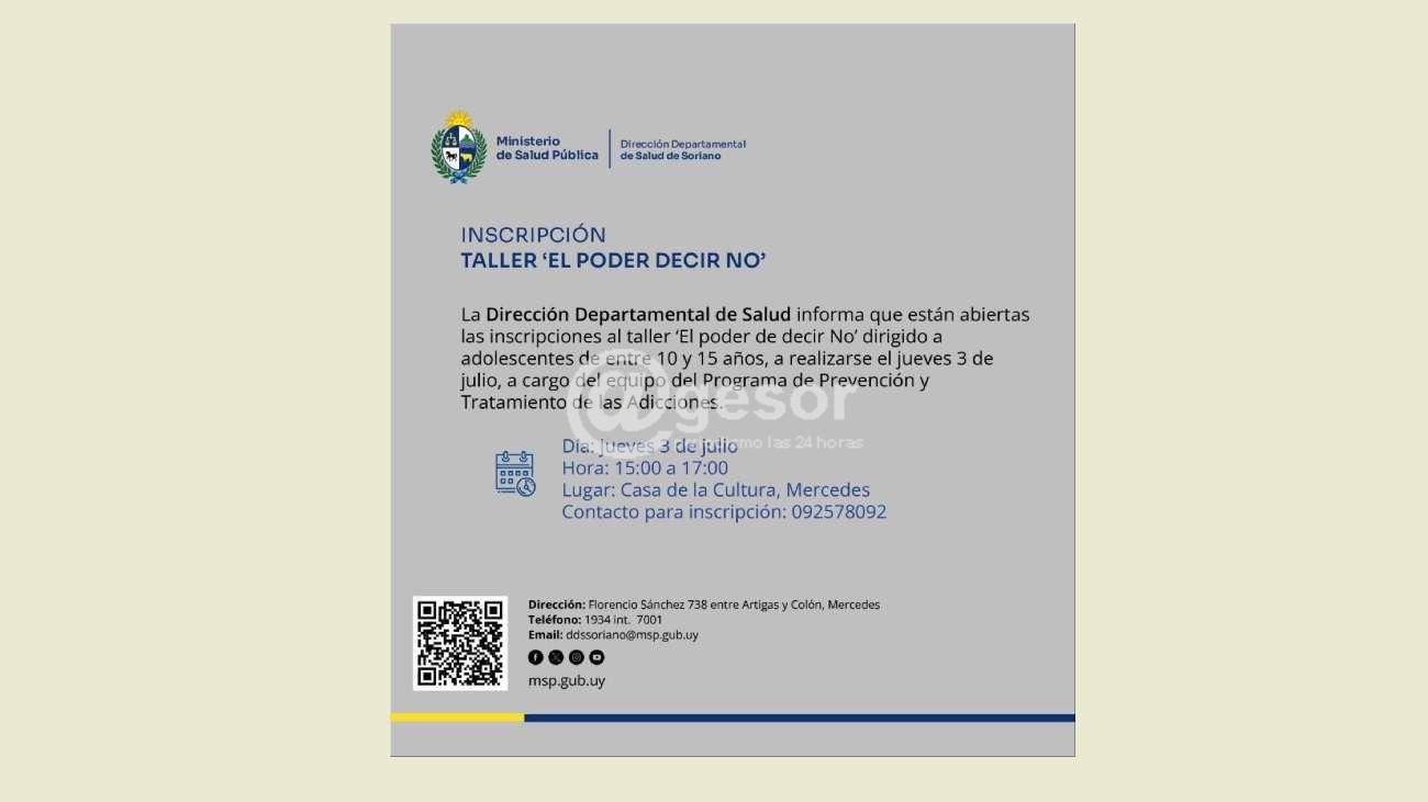 La Dirección Departamental de Salud (DDS) informa que se encuentran abiertas las inscripciones para el taller “El poder de decir No”, dirigido a adolescentes de entre 10 y 15 años.