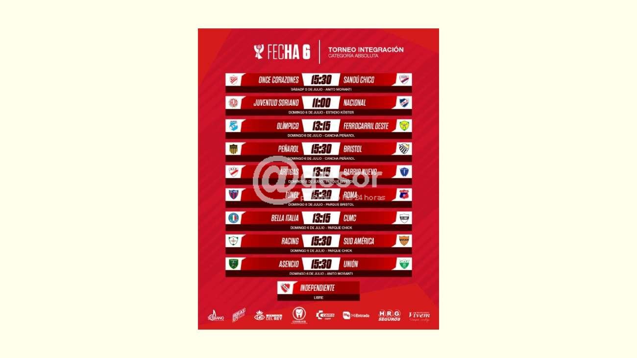 Se reunió la liga departamental de fútbol de Soriano bajo la presidencia del Dr. Pablo Marrero a los efectos de fijar la 6ta fecha del torneo de categoría absoluta. En ese sentido se estará jugando el día sábado 15 y 30 horas en cancha Anito Morantti, Once Corazones y Sandu Chico, jugando ese día por el aniversario del Once. Mientras que el Domingo 6 se completa la fecha jugando a las 11 horas en el Estadio Koster, Juventud Soriano y Nacional . Y en la Tarde en cancha de Peñarol y desde 13 y 15 horas lo harán Olímpico y Ferrocarril, y a las 15 y 30 horas jugaran Peñarol y Bristol.