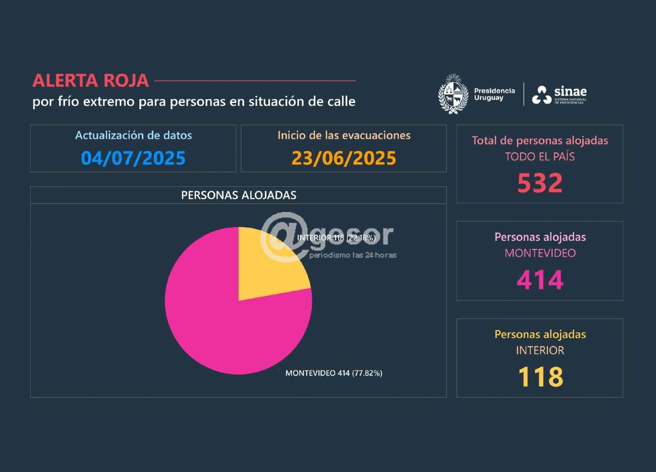 Según el último relevamiento del Sinae, en la noche del jueves 3 de julio, en el marco del operativo tras la alerta roja debido a las inclemencias climáticas, se brindó atención a 2.678 personas en todo el país, 2.146 en refugios del Ministerio de Desarrollo Social y 532 en centros de evacuación.