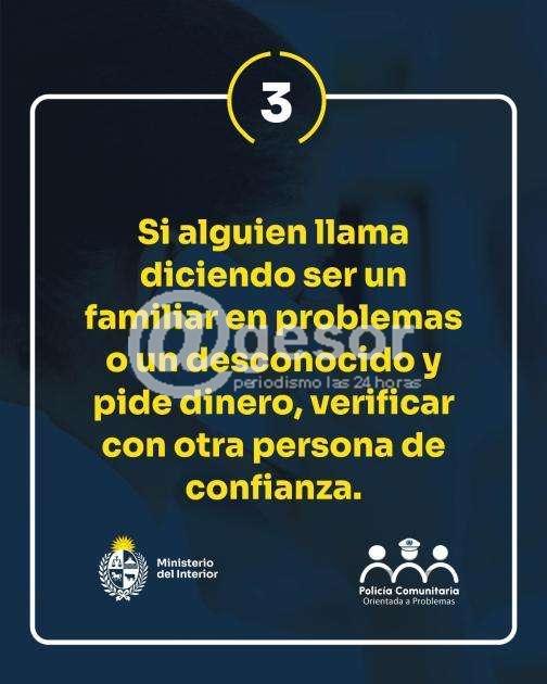 Dentro de las acciones a tomar, el Ministerio del Interior recomienda que tras recibir una llamada telefónica de un supuesto familiar solicitando dinero por alguna razón, o ante la presentación de una persona en el domicilio alertando sobre un posible corralito bancario, se corrobore la veracidad de la información recibida con una persona de confianza o un familiar.