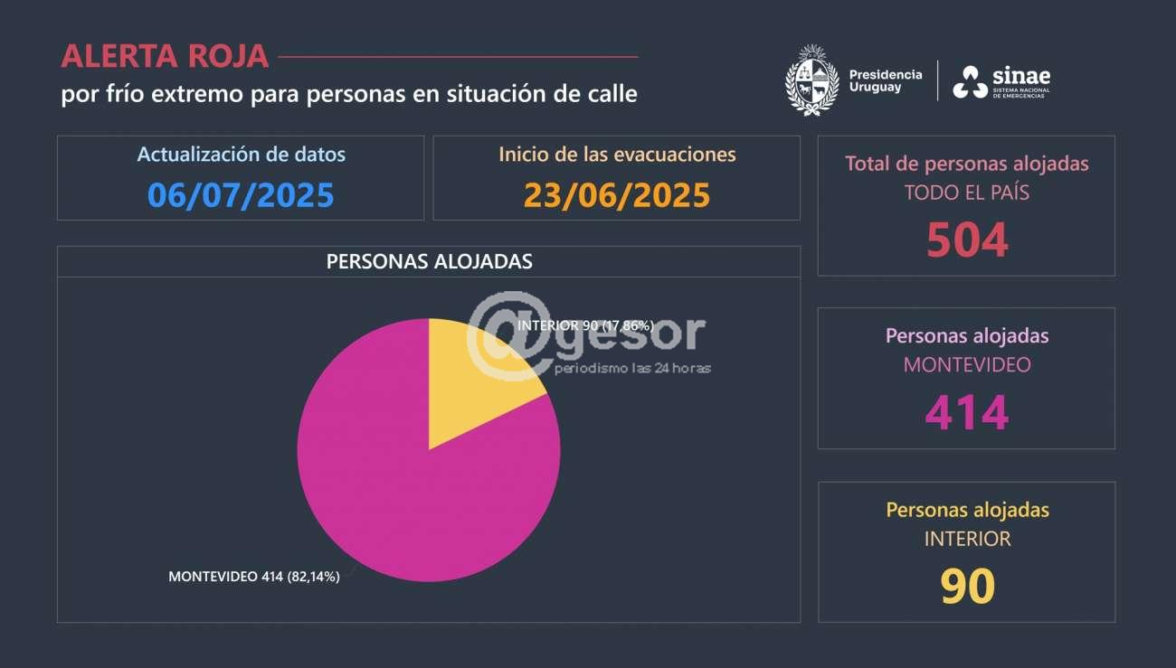 De acuerdo a la información registrada en el Sistema de Gestión de Seguridad Pública (SGSP) del Ministerio del Interior, en la decimotercera noche del Operativo del Sinae, se ocuparon 504 plazas: 414 en Montevideo y 90 en el interior.