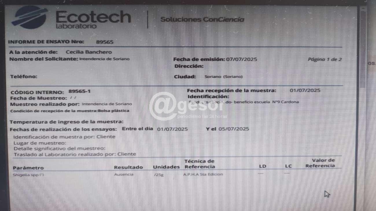 Este lunes la Oficina de Relaciones Públicas de la Intendencia difundió el resultado del análisis realizado a una muestra de chacinados recogido en Cardona y que se presumía podía ser la causa de la intoxicación que sufrió una niña de esa localidad. Las pruebas de laboratorio descartan que se trate de la bacteria shigella, sospechosa que provocar la intoxicación de la niña.