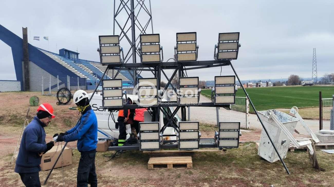 Ya se procedió a la colocación de las luminarias en cada una de las parrillas que van en las cuatro torres del estadio, las que serán encastradas en la parte superior de éstas. También se realizan las correspondientes conexiones a la nueva red de cableado para la alimentación eléctrica del sistema lumínico.