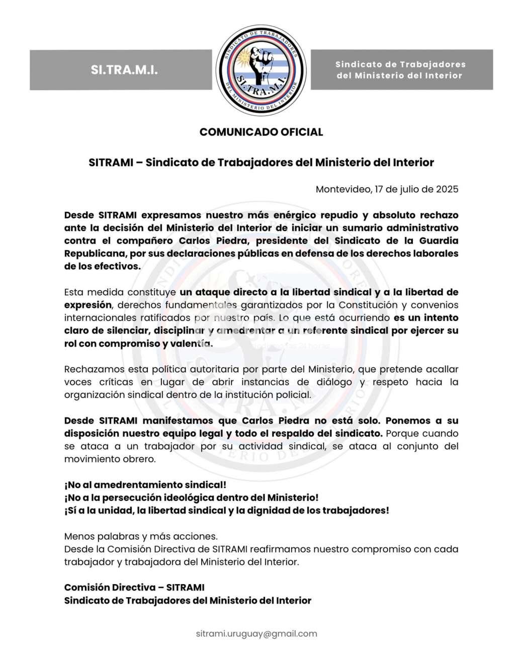 Desde SITRAMI expresamos nuestro más enérgico repudio y absoluto rechazo ante la decisión del Ministerio del Interior de iniciar un sumario administrativo contra el compañero Carlos Piedra, presidente del Sindicato de la Guardia Republicana, por sus declaraciones públicas en defensa de los derechos laborales de los efectivos.